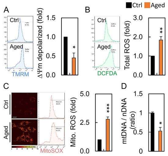 Aging leads to mitochondrial dysfunction: (A) mitochondrial membrane potential, (B) cellular ROS levels, (C) mitochondrial ROS, and (D) mitochondrial DNA content in in HGL5 cells treated with or without hydrogen peroxide. * p < 0.05, ** p < 0.01, and *** p < 0.001.