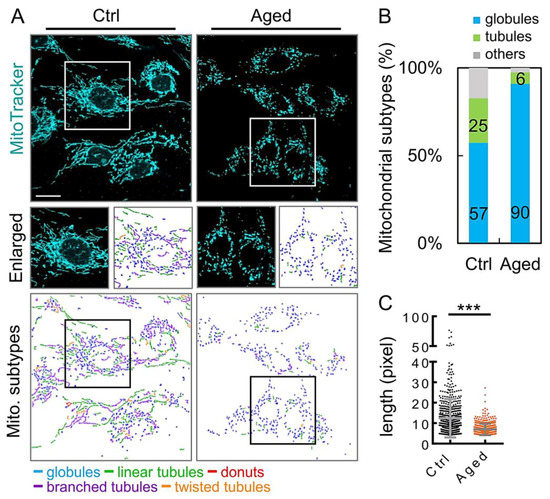 To assess whether the mitochondrial network of the aging granulosa cells was imbalanced, we analyzed changes in the mitochondrial morphology. The mitochondria were classified into three types according to their morphological characteristics (globules, tubules, and others), using the MicroP software [23]. After tracking mitochondria with fluorescent dyes, we found that mitochondrial elongation in the aging group was significantly reduced (Figure 4A). Moreover, the percentage of fragmented mitochondria shown by the aging group was significantly higher than that of the control group (Figure 4B). In addition, the average mitochondrial length was significantly reduced in the aged group compared to that in the control group (Figure 4C).