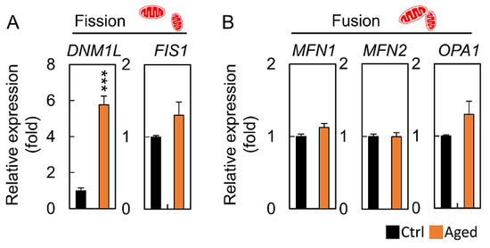 Aging leads to mitochondrial dynamics imbalance and increased DNM1L expression. (A,B) Quantitative real-time polymerase chain reaction analysis for mRNA expression of mitochondrial dynamics-related genes of granulosa cells among the control and aged groups. All values are normalized to GAPDH and expressed as a fold of control. *** p < 0.001.