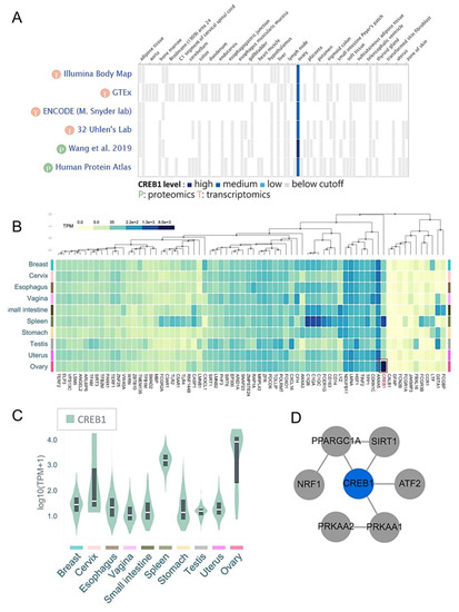 The level of CREB1 expression in different tissues. (A) CREB1 gene was analyzed for gene distribution and expression in different tissues using GTExPortal website. (B) Heatmap representing the CREB1 indexes of all the 72 genes across all the tissues from Web-based Gene Set analysis Toolkit. (C) The CREB1 mRNA levels in 10 different types of tissues. (D) The protein–protein interaction networks of genes associated with CREB1.