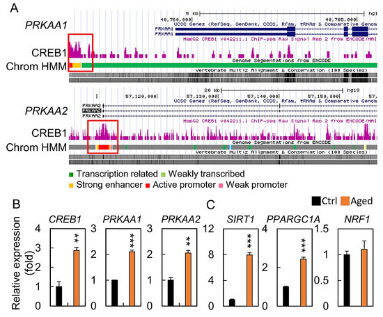 Age-related changes in key metabolic and transcriptional regulators. (A) Scheme of the human genomic region encompassing the CREB1 promoter. The purple peaks represent the promoter binding regions, according to ENCODE. The red square shows the amplified region in the promoter. (B,C) mRNA expression level of CREB1, PRKAA1, PRKAA2, SIRT1, PPARGC1A, and NRF1. All values were normalized to GAPDH and expressed as a fold of control. ** p < 0.01, and *** p < 0.001.