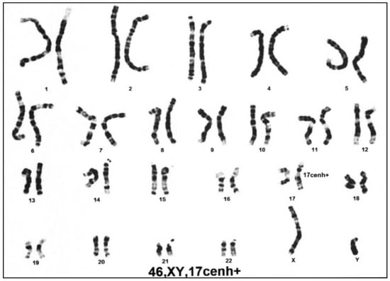 The cytogenetic chromosomal study showed no abnormal finding in the 46 XY chromosomes, excluding the normal variation in 17 centromeric heterochromatin.