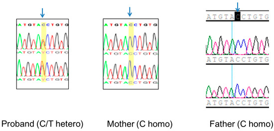 Genomic DNA was extracted from buccal swab samples of the proband. Whole exons and their flanking intronic regions were captured using Agilent SureSelect kits (version C2, December 2018) and sequenced using the NovaSeq platform (Illumina, San Diego, CA, USA). Raw genome sequencing data were aligned to the human reference sequence GRCh37 (hg19). Differences were called and annotated. The mean depth of coverage was 100X (>10X = 99.2%). The variant interpretation was performed as described previously [13,14]. Variants with minor allele frequency (MAF) < 0.005 were selected based on the population genomic databases of ExAC (http://exac.broadinstitute.org/), 1000 Genomes (https://www.ncbi.nlm.nih.gov/variation/tools/1000genome), GO-ESP (http://evs.gs.washington.edu/EVS/), GnomAD (http://gnomad.broadinstitute.org/), and KRGDB consisting of 1722 Korean individuals (3444 alleles; http://coda.nih.go.kr/coda/KRGDB/index.jsp). Splice site variants were analyzed on the basis of in silico splice predictors, such as MaxEntScan [15]. The prioritized variants were categorized based on the 2015 American College of Medical Genetics and Genomics-Association for Molecular Pathology (ACMG-AMP) guideline for the interpretation of sequence variants [16]. ExPASy was used to predict the translation product of a variant (https://web.expasy.org/translate/).