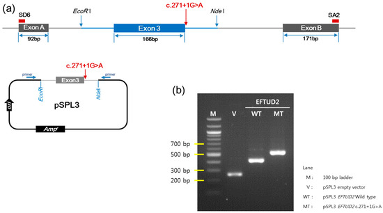 To explore the effects of the splice site variant (c.271+1G>A) on intron 3, an in vitro splicing assay was performed using the minigene assay. Wild-type and mutant EFTUD2 exon 3 (166 bp) and its flanking intron 2 (297 bp) and intron 3 (288 bp) were amplified using primers containing additional EcoRl and Ndel restriction sites. The amplified fragments and pSPL3 exon trapping vectors were digested with a restriction enzyme. Exon A and exon B were cloned into pSPL3 vectors. The wild type and mutant-containing vector sequences were confirmed with Sanger sequencing.