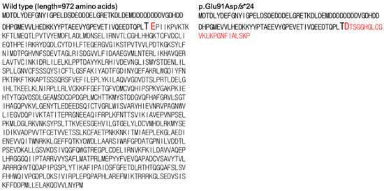 In silico prediction of the effect of the c.271+1G>A variant on translation, compared to the wild-type. The full protein (left) was expected to be truncated (right) in the c.271+1G>A variant. The red letters were indicated the amino acid residues that were altered due to the aberrantly spliced product.