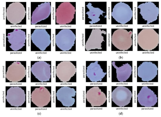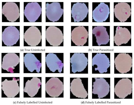 (a) Correctly labelled uninfected images (b) Correctly labelled parasitized images (c) Falsely labelled uninfected images and (d) Falsely labelled parasitized images.