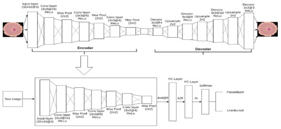 While testing, decoder is replaced by a flatten and two fully connected layers to serve our purpose of detecting malaria parasite from a blood smear. Hence, the final model is composed of 9 layers among which three are Convolutional layers, three are Max-pooling layer, one Flatten layer and two fully connected layers. Finally, fully connected layer is followed by a softmax layer to distribute predicted probabilities over two classes according to the objective of this task. The outline of our proposed model architecture is given in Figure 3.