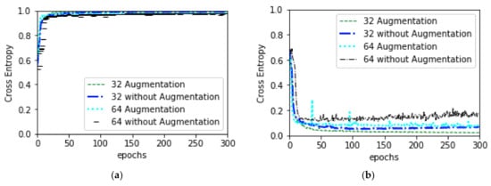 In order to optimize and to obtain better performances, data augmentation, without augmentation, classification using SVM and KNN was performed. For the augmentation experiment, augmentation as per the Table 1 was applied first. While performing 64 × 64 augmentation experiment, original image was resized to (64, 64) before applying augmentation where augmentation was performed after resizing original image into (32, 32) for the experiment of 32 × 32 augmentation. In both experiments, data was fed into the model according to batch size 32. For the without augmentation training, plain data was fed into the model according to batch size 64 after resizing the original image to (64, 64) or (32, 32) as per the experiment requirement. Weights and biases of all trainable parameters were randomly initialized at the beginning of training. To optimize the weights and biases, Stochastic Gradient Descent (SGD) [63] optimizer was used while performing the forward propagation. The learning rate was set to 0.001 with a momentum of 0.9. While performing back-propagation to calculate the error and update the weights and biases, cross entropy, shown in Equation (9), was used as a loss function. Predicted result and combined validation loss and accuracy of augmentation and without augmentation experiment for both image sizes are depicted in Figure 5; Figure 6, respectively.