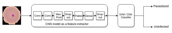 - Rajaraman, S.; Antani, S.K.; Poostchi, M.; Silamut, K.; Hossain, M.A.; Maude, R.J.; Jaeger, S.; Thoma, G.R. Pre-trained convolutional neural networks as feature extractors toward improved malaria parasite detection in thin blood smear images. PeerJ 2018, 6, e4568. [Google Scholar] [CrossRef] [PubMed]