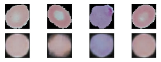 Finally, autoencoder based architecture was explored to increase the model’s performance. It is found that the autoencoder based experiments outperforms other experiments. Autoencoder is composed of two main components which are Encoder and Decoder discussed in the proposed model subsection. The main aim of an Autoencoder is dimensionality reduction, but to detect malaria parasite, it is used as a classifier. This classifier can classify infected and parasitized images from a microscopic blood smear. To train the classifier, at first, full Autoencoder network was trained with the augmented training images where augmentation was performed as per Table 1. Mean Square Error (MSE) loss function shown in Equation (15) was used while training to calculate the losses. To minimize the loss and update the weights RMSprop [71] optimizer was used with 0.001 learning rate. Figure 9 depicts the few reconstructed images after training Autoencoder 500 epochs.