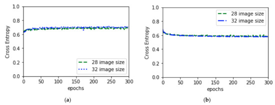 Training behavior of Autoencoder after freezing encoder layer: (a) depicts the validation accuracy for image (32, 32) and (28, 28) and (b) depicts validation loss for image (32, 32) and (28, 28) while training Autoencoder 300 epochs.