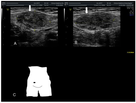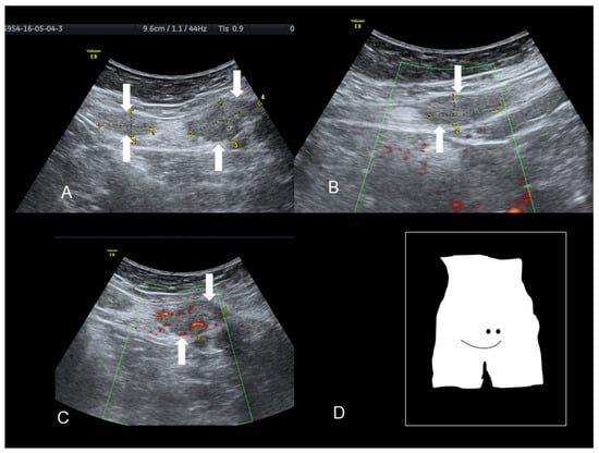 Ultrasonographic images of two nodules (A–C) (see white arrows), of scar endometriosis with some color spots (C) due to internal vascularization, infiltrating the external oblique muscle in a woman with a previous cesarean section some years before. Drawing of the location (D).