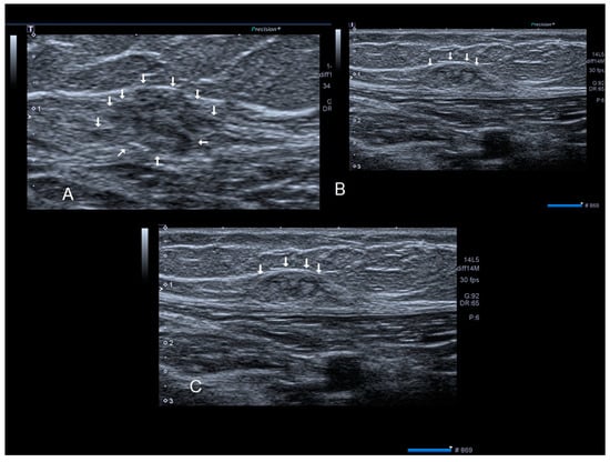 Ultrasonographic images of one nodule (A–C) (see thin with arrows), of scar endometriosis infiltrating the external oblique muscle in a woman with a previous cesarean section some years before cesarean scar endometriosis.