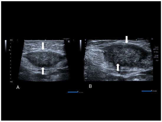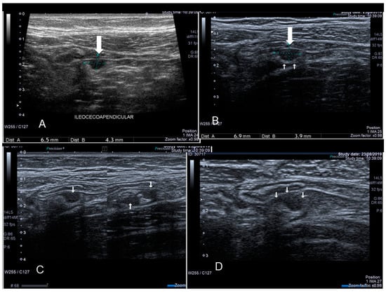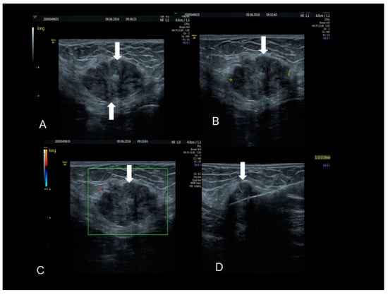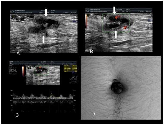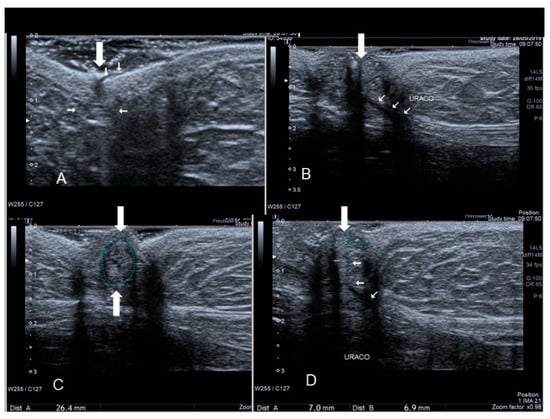 The ultrasonographic appearance of another Villar’s nodule (thick and thin white arrows) (A–D).