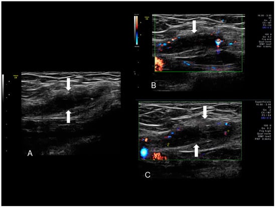 Sonographic features of right inguinal endometriosis (see white arrows) (A) presenting as a cystic mass with internal septa, hypoechoic content and few peripheral color spots located in inguinal area due to a scanty vascularization (B,C).