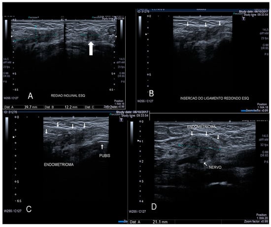 - Yang, D.M.; Kim, H.C.; Ryu, J.K.; Lim, J.W.; Kim, G.Y. Sonographic Findings of Inguinal Endometriosis. J. Ultrasound Med. 2010, 29, 105–110. [Google Scholar] [CrossRef] [PubMed]