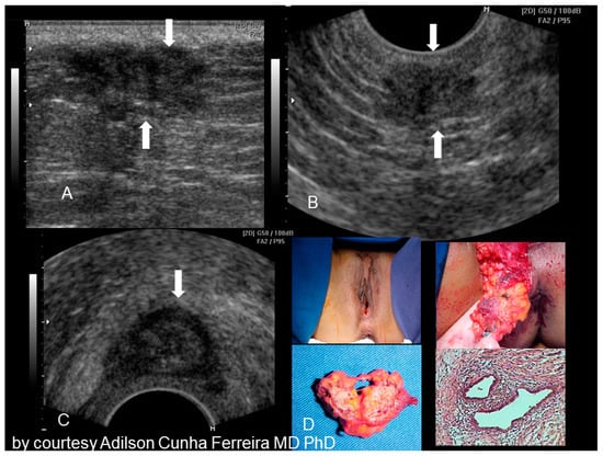 Sonographic features of perineal endometriosis (see white arrow) (A–C). The visual appearance, the specimen, and the pathology picture (D) (courtesy of Adilson Cunha Ferreira, MD, PhD).