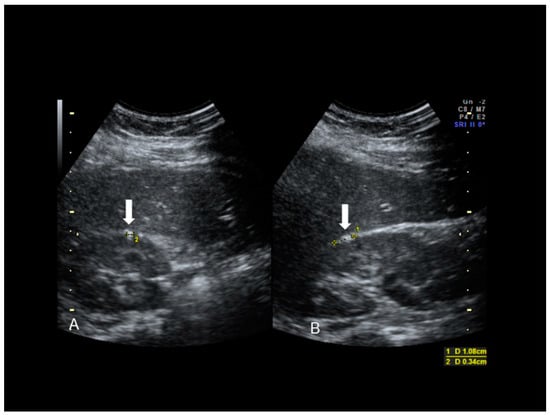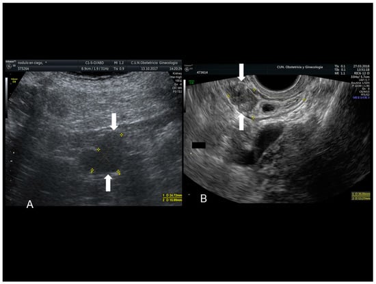 Scar endometriosis may present as a hypoechoic solid nodule with hyperechoic spots or strands which represent fibrosis within the scar tissue, a hyperechoic peripheral ring, spiculated borders and a single vessel entering the nodule from the periphery (Figure 1 and Figure 2) [,,]. In nodules larger than 30 mm, cystic portions and/or fistulous tract, loss of oval or round shape, multiple vascular pedicles, and central vascularization are more frequent [].