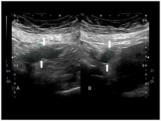 Sonographic features of an endometriotic nodule of cecum (see white arrow) (A) and appendix (see white arrow) (B).