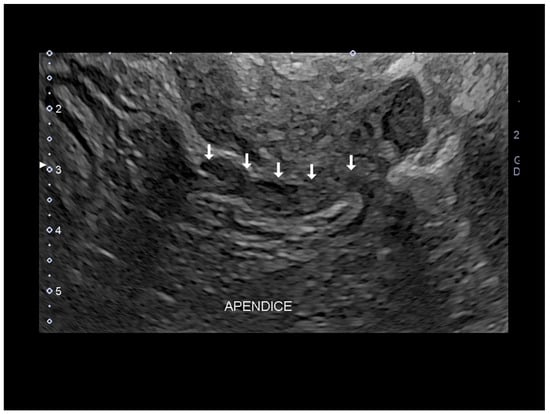 Endometriosis of appendix (see white arrow) by transvaginal endometriosis confirmed at surgery.
