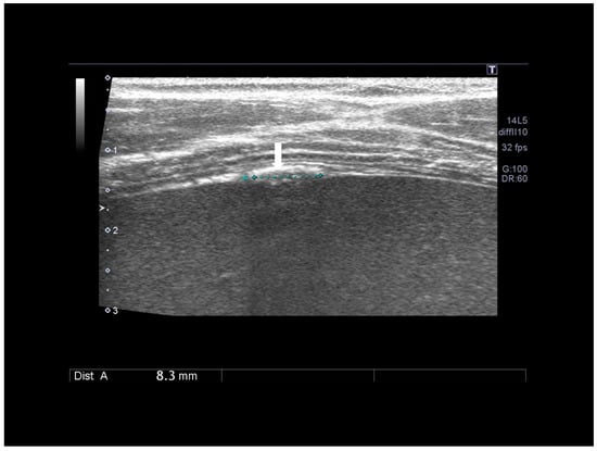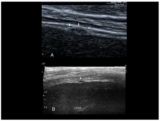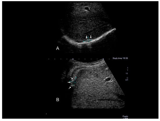 The ultrasonographic appearance of a Villar’s nodule (see white arrows) in a woman without previous abdominal surgery.