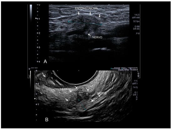 - Arányi, Z.; Polyák, I.; Tóth, N.; Vermes, G.; Göcsei, Z. Ultrasonography of sciatic nerve endometriosis. Muscle Nerve 2016, 54, 500–505. [Google Scholar] [CrossRef] [PubMed]