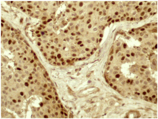 Twist protein showed a nuclear or cytoplasmic signal (Figure 1) and it was expressed in the neoplastic cells in 51 cases, with a score that was variable, being 1, 2, and 3 in 12, 19, and 20 cases, respectively. The cases were subsequently divided into two different scoring groups (independently from cytoplasmic or nuclear staining)—26 with absent/low signal (score 0–1) and 39 with moderate/high signal (score 2–3). Variable expression was also detected in normal tissue.