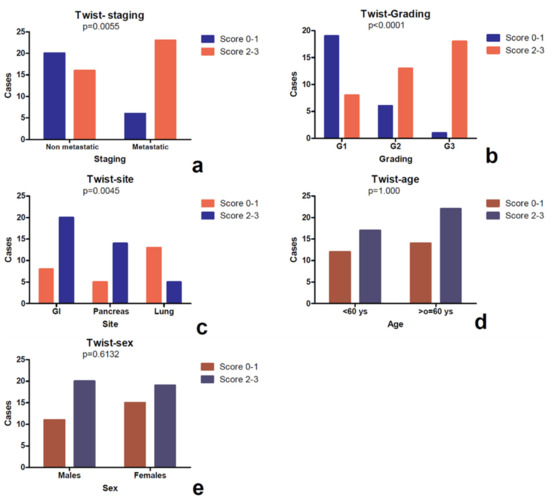 Study of association between the Twist score and the clinico-pathological parameters assessed by the Fisher’s exact test. It was observed that a higher signal (score 2–3) was more frequent in metastastic cases instead of non metastatic forms (a), in cases with higher grading (b) and in NEN located in the gastrointestinal tract, compared to pancreatic and pulmonary forms (c). No correlation was evident between Twist score and clinical parameters (sex and age) (d,e).