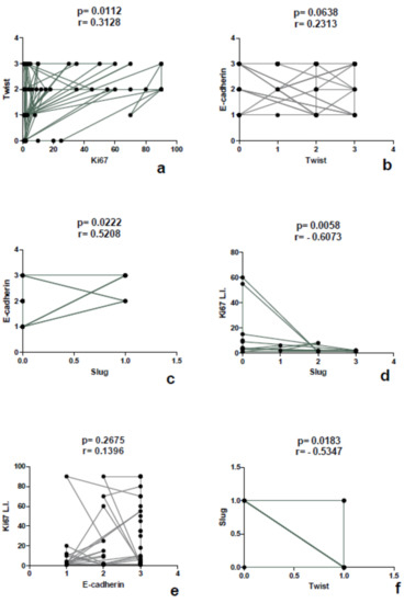 The comparison between markers highlighted a direct correlation between Twist and Ki67 L.I. (p value = 0.0112, r = 0.3128) (Figure 4).