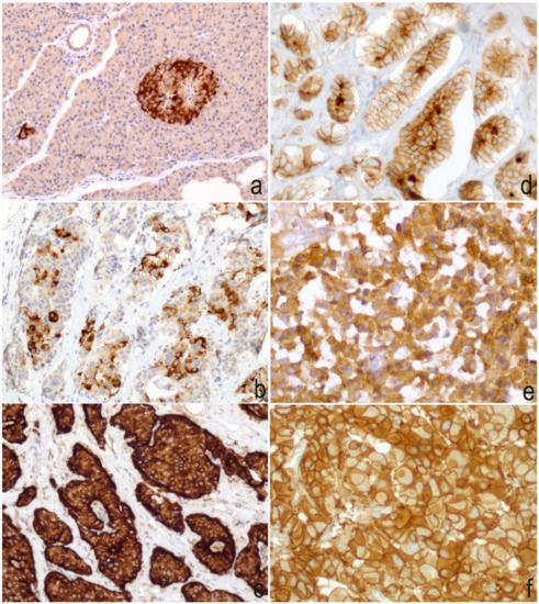 Slug immunoscore—(a) an intense cytoplasmic immunoreaction was evident in the normal pancreatic tissue that was located exclusively in the neuroendocrine compartment. Negative scores were exocrine pancreas (20× magnification); (b) cytoplasmic signal was observed in 15–50% of neoplastic cells (20× magnification); (c) in this field, strong and diffuse (>50%) immunoreaction was detected in neoplastic cells (40× magnification); (d) 20× magnification, and (e) 40× magnification. E-cadherin expression was reduced compared to cases where the expression was preserved (f) 40× magnification.