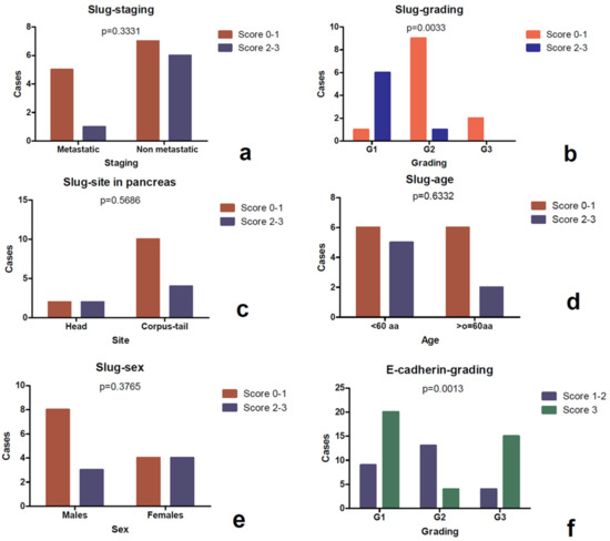 Study of association between the Slug score and the clinico-pathological parameters assessed by the Fisher’s exact test. It was observed that a higher Slug score (score 2–3) was correlated with a lower grading (b), as well as E-cadherin loss resulted was to be statistically correlated to higher grading (f). Slug was not associated with stageing (a), pancreatic regions (c), age (d) and sex (e).