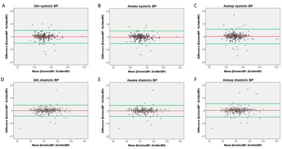 Bland–Altman Plots. (A) 24-hour systolic measurements, (B) awake systolic measurements, (C) asleep systolic measurements, (D) 24-hour diastolic measurements, (E) awake diastolic measurements, (F) asleep diastolic measurements.
