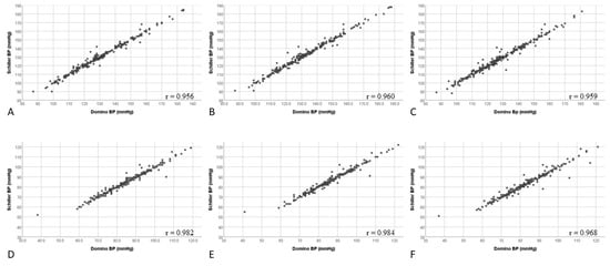Correlation of systolic and diastolic blood pressure values generated by DominoBP and SchillerBP software for 24-hour, awake, and asleep blood pressure measurements. (A) 24-hour systolic measurements, (B) awake systolic measurements, (C) asleep systolic measurements, (D) 24-hour diastolic measurements, (E) awake diastolic measurements, (F) asleep diastolic measurements.