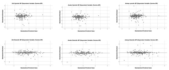 Residual plots are shown in Figure 4; they show unbiased and homoscedastic patterns with few outliers for both systolic and diastolic values during the different measurement periods.