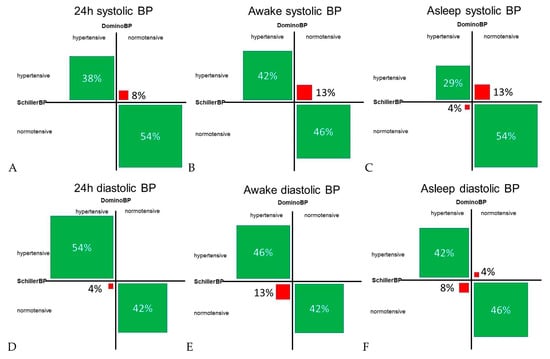 Concordant and discordant blood pressure classification in cases with a systolic and diastolic blood pressure difference of > 5 mmHg between blood pressure data generated by DominoBP and SchillerBP software. Normotensive values for systolic BP: (A) BP < 130 mmHg, (B) BP < 135 mmHg, (C) BP < 120 mmHg; normotensive values for diastolic BP: (D) BP < 80 mmHg, (E) BP < 85 mmHg, (F) BP < 70 mmHg; hypertensive BP is defined as ≥ the defined normotensive BP values; green fields: BP classification concordance between data generated by DominoBP and SchillerBP, i.e., both generated are classified as hypertensive or normotensive BP; red fields: BP classification discordance between data generated by DominoBP and SchillerBP, i.e., according to DominoBP generated data BP values are classified as hypertensive BP, while according to SchillerBP, thegenerated data BP values are classified as normotensive BP and vice versa); BP: blood pressure.