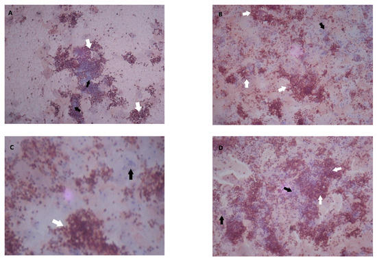 Matrix metalloproteinase (MMP)-9 and tissue inhibitor of metalloproteinase (TIMP)-1 staining in endometrial epithelial tissue. White arrows, positive staining; black arrow, negative staining. (A) MMP-9 weak staining (20%–50% positive staining per field of view); (B) MMP-9 moderate staining (50%–80% positive staining per field of view); (C) MMP-9 strong staining (>80% positive staining per field of view); (D) TIMP-1 moderate staining (50%–80% positive staining per field of view).