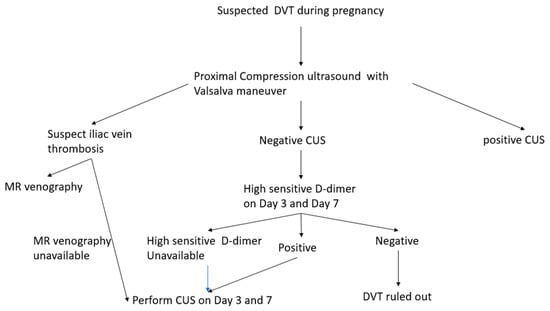 The diagnostic evaluation for DVT in a pregnant individual should begin with CUS (Figure 4). The patients with the negative CUS should be followed on day 3 and day 7. The highly sensitive D-dimer, if available, can performed to decide the need for repeat CUS. If highly sensitive d-Dimer is not available then repeat CUS on day 3 and day 7. The suspected iliac vein thrombosis can be evaluated with MR venography.