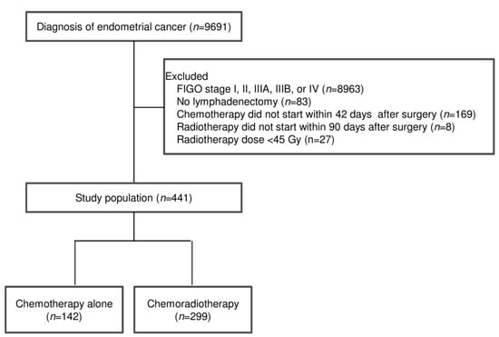 All data in this study were retrieved and analysed within the Health and Welfare Data Science Center of Taiwan. Using data from the Taiwan Cancer Registry database, we enrolled patients who had pathologically confirmed FIGO stage IIIC endometrial cancer between 2009 and 2015 []. The Taiwan Cancer Registry contains prospectively gathered, detailed cancer-related information regarding staging, treatment, and cross-linkage with other population-based registries, including the National Death Registry, to ensure lifelong follow-up. We used the recorded stage; histological type and grade; treatment details such as type of surgery, radiotherapy dose, and technique; and chemotherapy start date in this study. Our study was approved by the institutional review board (IRB: B-EX-108-028, 12 August 2019).