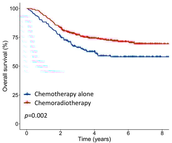 The median follow-up period was 3.6 (interquartile range (IQR): 1.8–5.4) years. For the entire cohort, the 5-year OS was 71.1%. The 5-year OS rates of patients with stage IIIC1 and IIIC2 were 74.6% and 66.9%, respectively (p = 0.08), whereas the 5-year OS rates of patients divided into three groups based on the number of positive LNs (1, 2–5, and ≥ 6) were 78.3%, 74.8%, and 57.2%, respectively (p < 0.001). Patients who received chemoradiotherapy had significantly higher 5-year OS than those who received chemotherapy alone (76.2% versus 61.2%, p = 0.002; Figure 2). Similar results were observed in landmark analyses restricted to patients surviving 1, 1.5, and 2 years after surgery (Figure S1).