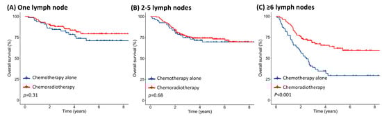 Kaplan–Meier survival curves showing overall survival with chemotherapy alone and chemoradiotherapy considering the number of positive lymph nodes. (A) One lymph node, (B) 2–5 lymph nodes, and (C) ≥ 6 lymph nodes; for adjuvant chemoradiotherapy or chemotherapy alone in all patients.
