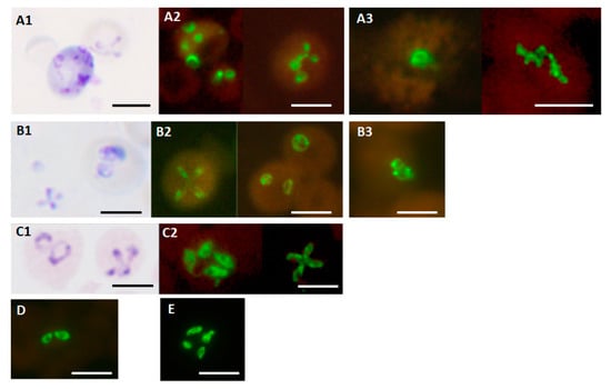 Photographs showing the results of the Babesia genus-specific FISH test on different Babesia species. A—B. microti; B—B. duncani; C—B. divergens; D—B. bovis; E—B. bigemina with parasite sources described in the Methods and Materials section. Photographs of the parasites stained with Giemsa in the smears used for the FISH tests are shown in the case of B. microti (A1), B. duncani (B1), and B. divergens (C1). Fluorescence observed in the corresponding FISH tests on smears from the same preparations are shown in (A2) for B. microti; (B2) for B. duncani; (C2) for B. divergens. Fluorescence observed in the FISH tests performed on B. bovis (D) and B. bigemina (E) are also shown. Fluorescence observed in the FISH tests performed on different blood smears from two patient samples received for testing at IGeneX with species confirmed by DNA sequencing are shown in (A3) for B. microti and (B3) for B. duncani. Photographs were taken at ×1000 magnification. Scale bars represent approximately 5 μm.