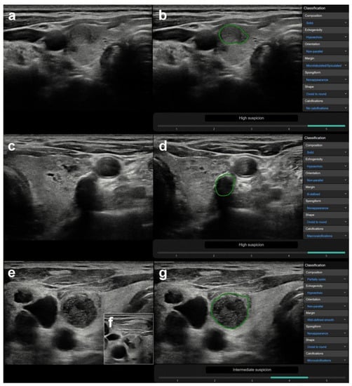 - Choi, S.H.; Kim, E.K.; Kwak, J.Y.; Kim, M.J.; Son, E.J. Interobserver and intraobserver variations in ultrasound assessment of thyroid nodules. Thyroid Off. J. Am. Thyroid Assoc. 2010, 20, 167–172. [Google Scholar] [CrossRef] [PubMed]