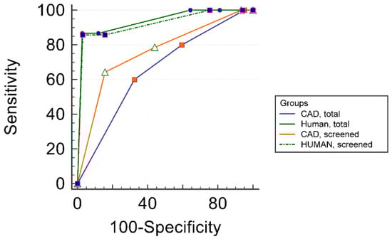 | Diagnostic Parameter | Human, All | CAD, All | CAD, Screened | Human, Screened | p Values of Comparisons 4 | |||