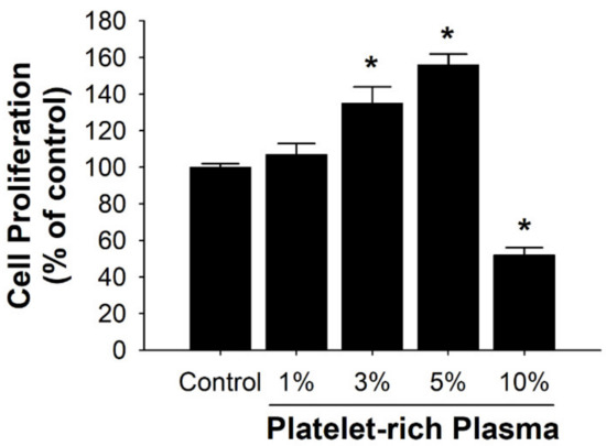 Effects in different concentrations of platelet-rich plasma (PRP) on cell proliferation of human fibroblast cells (HFCs) evaluated by MTT assays. Data are presented as the mean ± SD of three experiments performed in triplicate. * p < 0.05 contrasted to the control group.