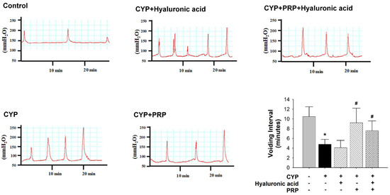Contrasted to those in the control group, the voiding interval values (time between voids) in the CYP plus intravesical instillation with normal saline and hyaluronic acid (1 mg/mL) groups significantly decreased. Additionally, contrasted to those in the CYP-induced acute IC/PBS group, the voiding interval values in the CYP plus intravesical instillation with PRP group (but not CYP plus hyaluronic acid and CYP plus PRP plus hyaluronic acid groups) significantly increased (Figure 3).