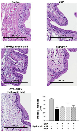 Average thickness of mucosa between saline-injected control; CYP plus intravesical instillation with normal saline; CYP plus intravesical instillation with hyaluronic acid (1 mg/mL); CYP plus intravesical instillation with PRP; and CYP plus intravesical instillation with hyaluronic acid (1 mg/mL) plus PRP groups. Each bar denotes the mean ± SD of six individual rats. * p < 0.05 contrasted to the control group.