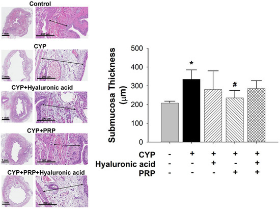 Average thickness of submucosa between saline-injected control, CYP plus intravesical instillation with normal saline, CYP plus intravesical instillation with hyaluronic acid (1 mg/mL), CYP plus intravesical instillation with PRP, and CYP plus intravesical instillation with hyaluronic acid (1 mg/mL) plus PRP groups. Each bar denotes the mean ± SD of six individual rats. * p < 0.05 contrasted to the control group. # p < 0.05 compared to the CYP group.
