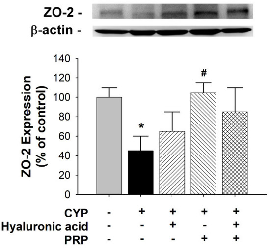 Alteration of ZO-2 expression in the bladder as indicated by Western blot analyses between saline-injected control, CYP plus intravesical instillation with normal saline, CYP plus intravesical instillation with hyaluronic acid (1 mg/mL), CYP plus intravesical instillation with PRP, and CYP plus intravesical instillation with hyaluronic acid (1 mg/mL) plus PRP groups. Each bar denotes the mean ± SD of six individual rats. * p < 0.05 compared to the control group. # p < 0.05 contrasted to the CYP group.