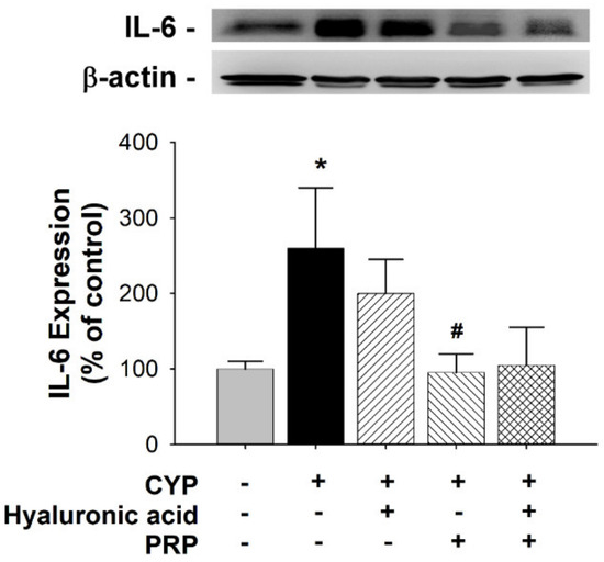 Alteration of IL-6 expression in bladder as indicated by Western blot analyses between saline-injected control, CYP plus intravesical instillation with normal saline, CYP plus intravesical instillation with hyaluronic acid (1 mg/mL), CYP plus intravesical instillation with PRP, and CYP plus intravesical instillation with hyaluronic acid (1 mg/mL) plus PRP groups. Each bar denotes the mean ± SD of six individual rats. * p < 0.05 contrasted to the control group. # p < 0.05 compared to the CYP group.