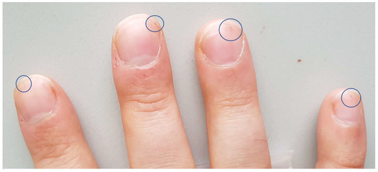 Clinical symptoms. Splinter hemorrhages discretely visible on the nails of the right hand (circles) were one of the first symptoms presented by the patient.